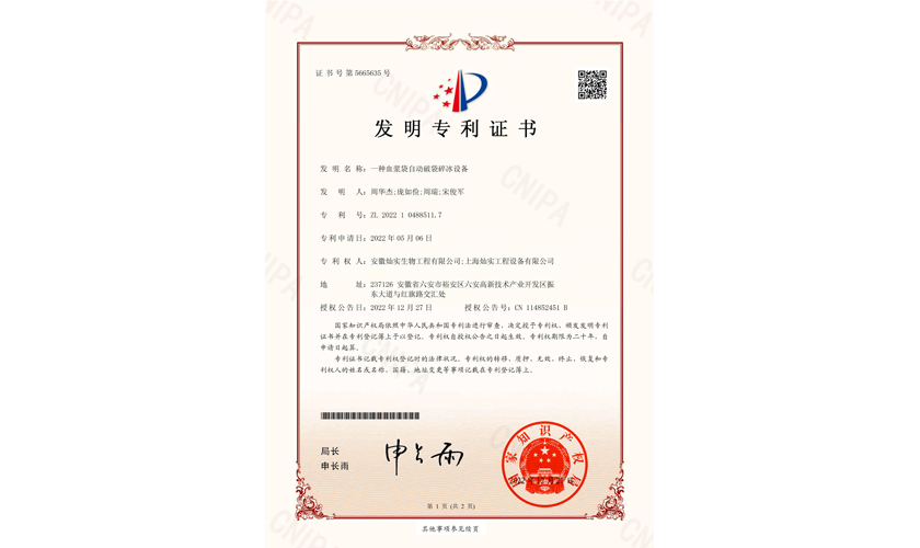 一種血漿袋自動破袋碎冰設(shè)備-發(fā)明專利證書
