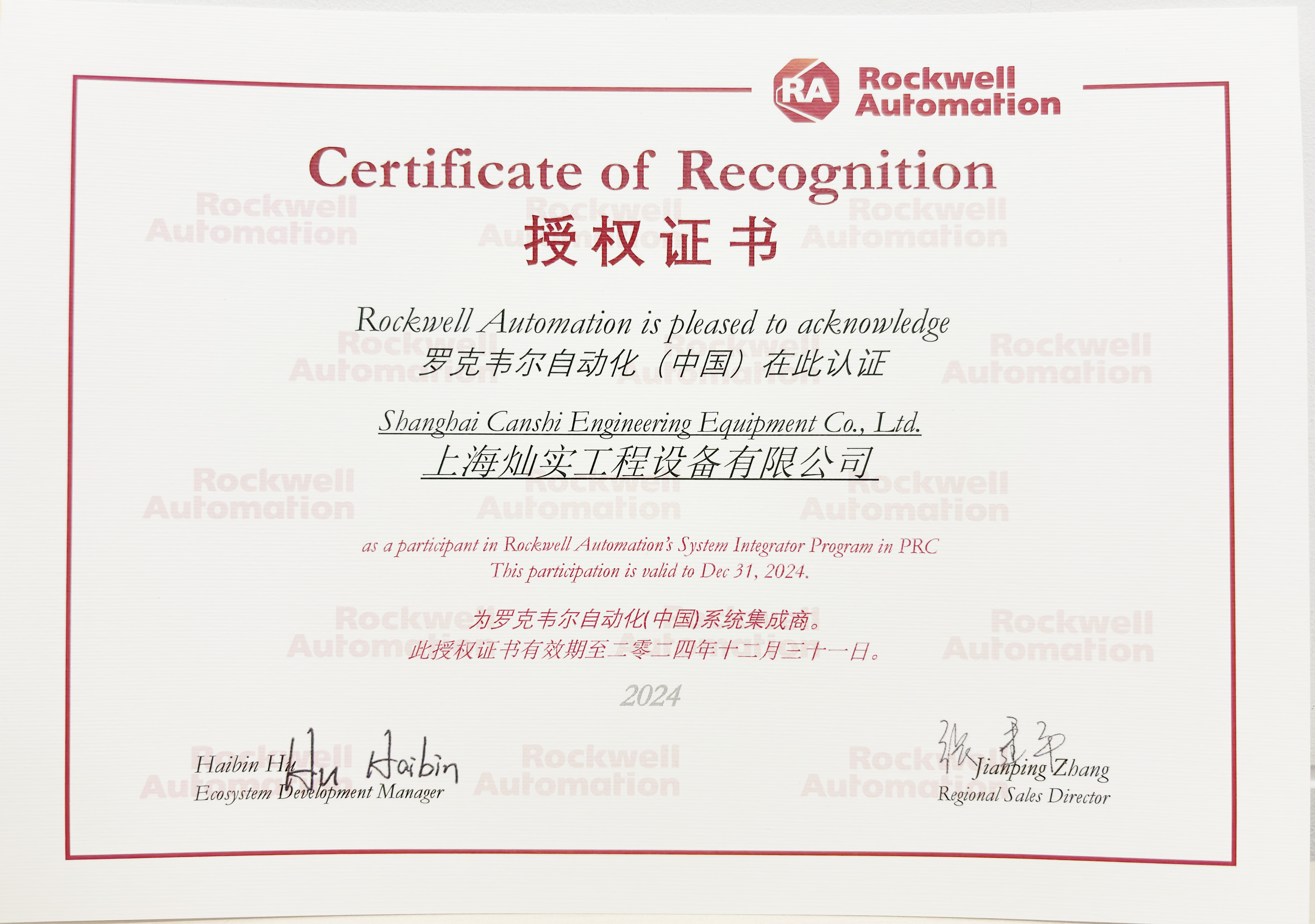 羅克韋爾自動化系統(tǒng)集成商授權(quán)證書